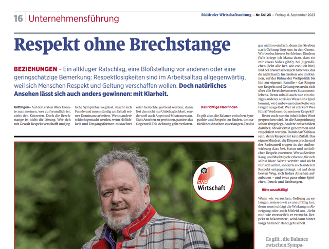 Respekt ohne Brechstange (Südtiroler Wirtschaftszeitung, 08.09.2023)